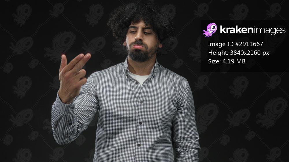 Man with curly hair and beard wearing a checked shirt extends hand and tilts head in studio against a black backdrop; contemplation.