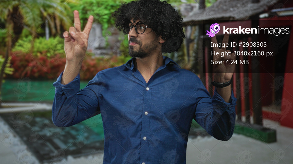 Man with curly hair and beard wearing blue shirt and glasses flashes peace sign with both hands beside a swimming pool by a building outdoors; playful. - Kraken Images