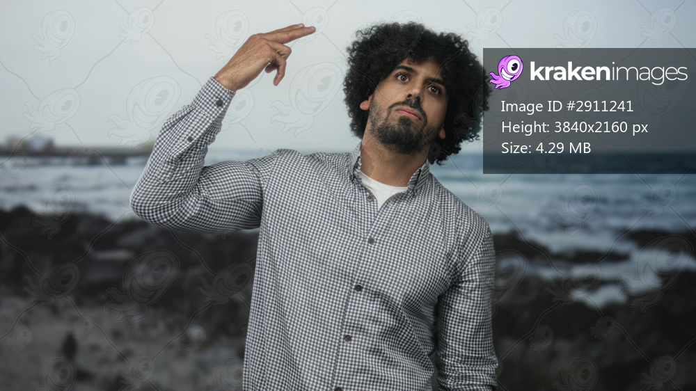 Man with curly hair and closed eyes facing a seaside studio backdrop in checked shirt with relaxed posture; quiet contemplation.