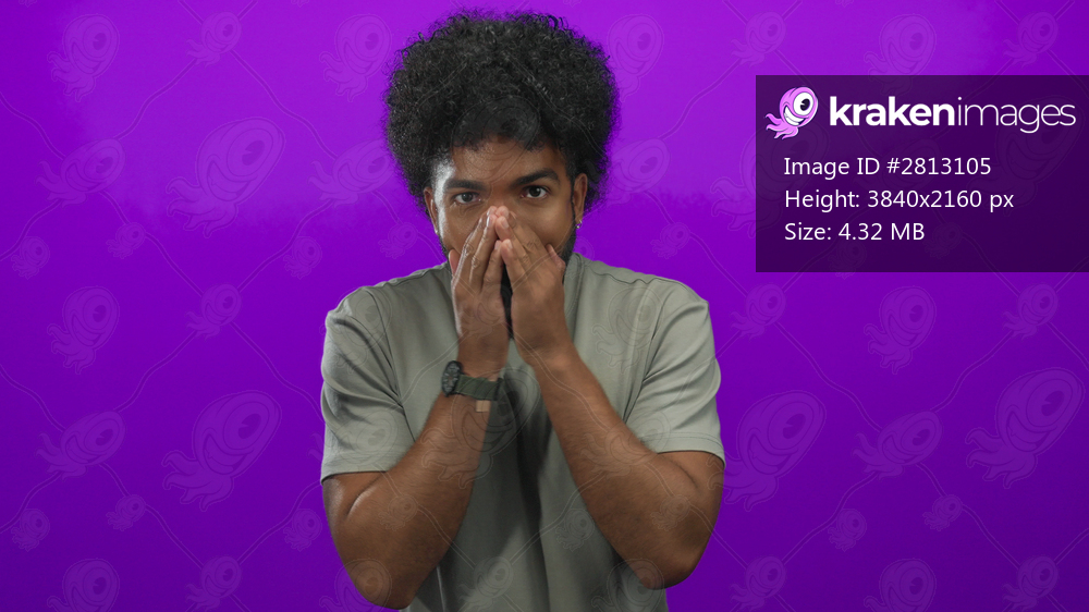 Man with curly hair expressing surprise against a vibrant purple backdrop, wearing a casual shirt with hands raised, conveying excitement or surprise.