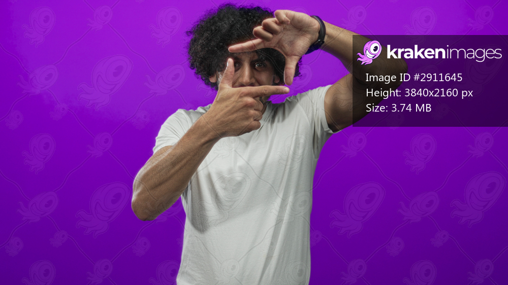 Man with curly hair framing his face with hands and fingers in a purple studio setting, forming a camera frame with his hands; playful creativity.
