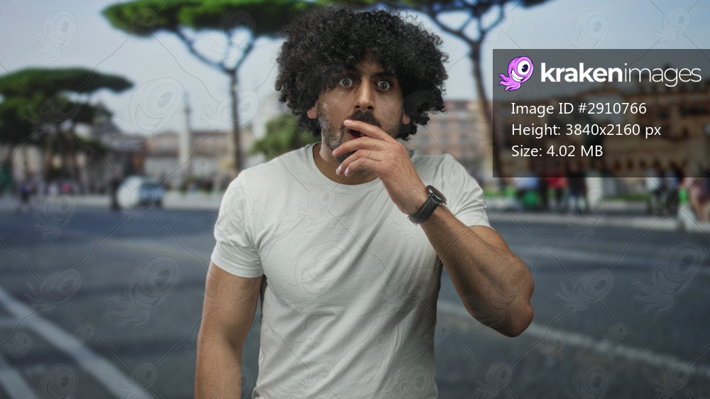 Man with curly hair gestures with hand and visible forearm on a busy city street plaza with trees and historic buildings; surprise.