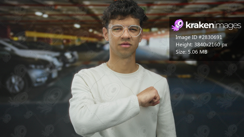 Man with curly hair and glasses in a white sweater punches camera with fist in parking building; frustration.