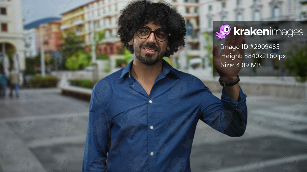 Man with curly hair and glasses waving hand while standing in a city street plaza beside a stone fountain and apartment buildings; approachable casual confidence. - Kraken Images