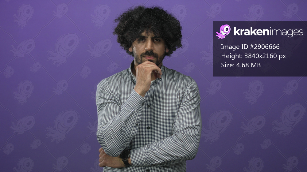Man with curly hair, hand on chin and crossed arms in studio with purple backdrop, looking at camera; contemplation.
