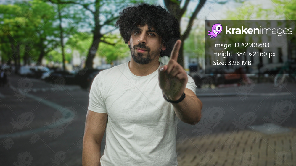 Man with curly hair, hand on chin thinking pose on city street wearing white t shirt and watch, trees and parked bikes behind him; contemplation.