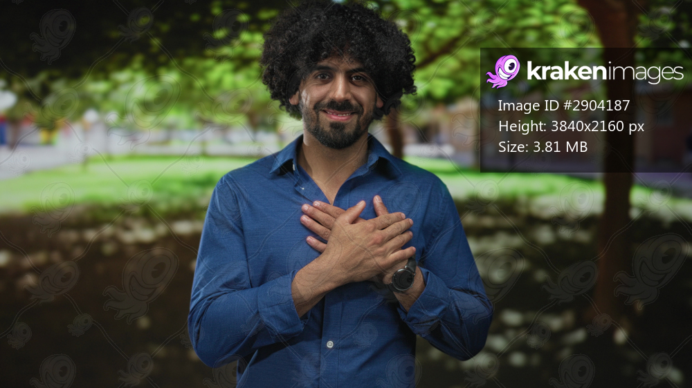 Man with curly hair holding hands over chest in park near building, smiling with gentle expression; sincere gratitude.