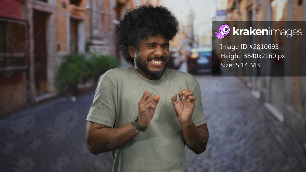 Man with curly hair in an outdoor city street displays a reaction of surprise and fear with expressive gestures.