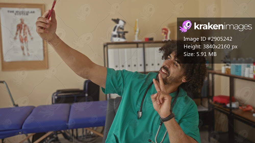 Man with curly hair in green scrubs and stethoscope holding a phone taking a selfie while flashing peace sign beside examination table in clinic building; medical confidence. - Kraken Images