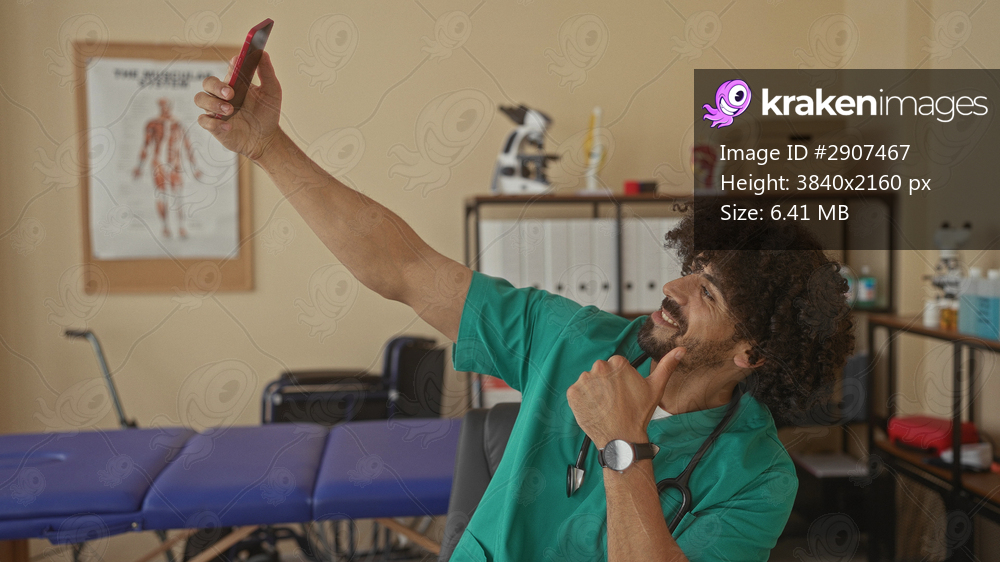 Man with curly hair in green scrubs and stethoscope holding a phone taking a selfie while flashing peace sign beside examination table in clinic building; medical confidence. - Kraken Images