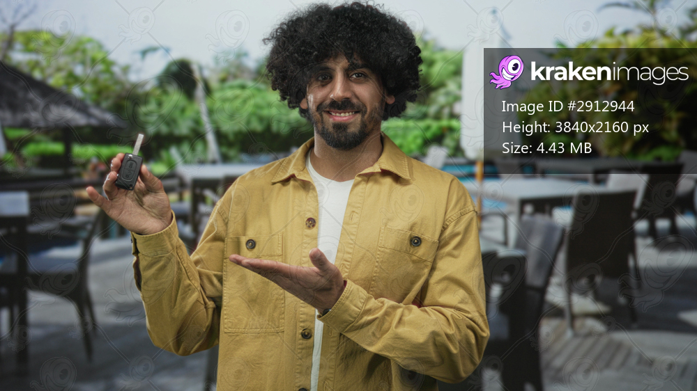 Man with curly hair in yellow jacket holding car key fob and presenting palm up while standing on a restaurant terrace outdoors near tables and umbrella; confidence. - Kraken Images