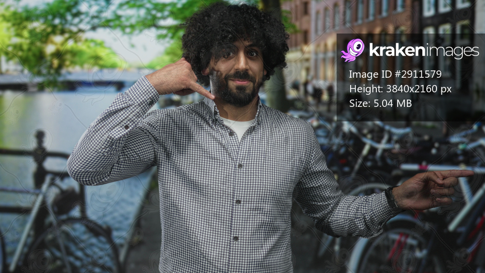 Man with curly hair making call hand gesture and pointing finger beside parked bicycles on street in amsterdam; playful invitation.