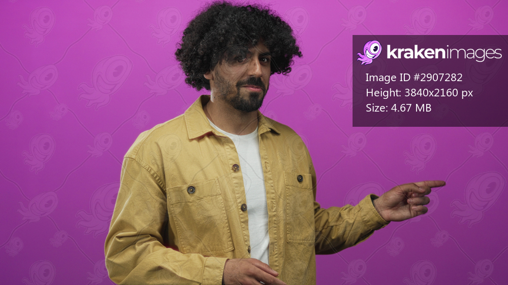 Man with curly hair pointing finger to the right in purple studio wearing yellow jacket and white tee; confident approachability.