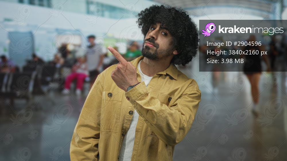 Man with curly hair pointing finger upward while looking up in busy airport terminal; curiosity discovery.