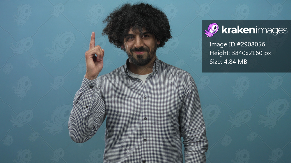 Man with curly hair pointing index finger at camera in blue studio wearing checked shirt and wristwatch; confidence.