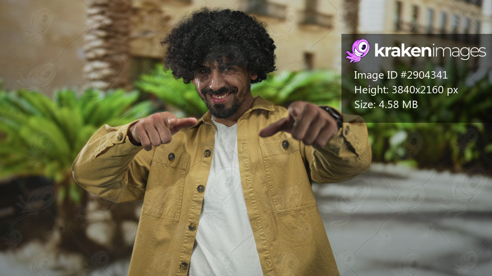 Man with curly hair points finger to camera and gestures with both hands on street near building; playful confidence.