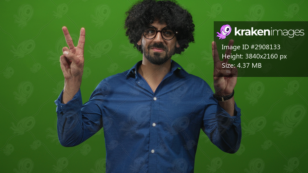 Man with curly hair and round glasses holding two finger peace sign showing hands in green studio; optimism hope.