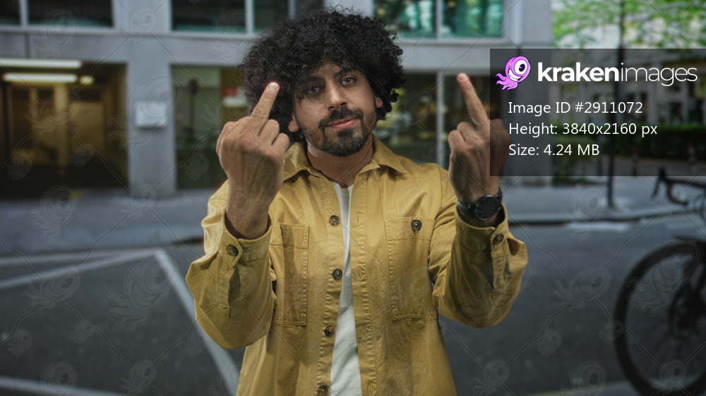 Man with curly hair shows both middle fingers and visible fingers gesture on a city street in front of a building; defiance protest statement.