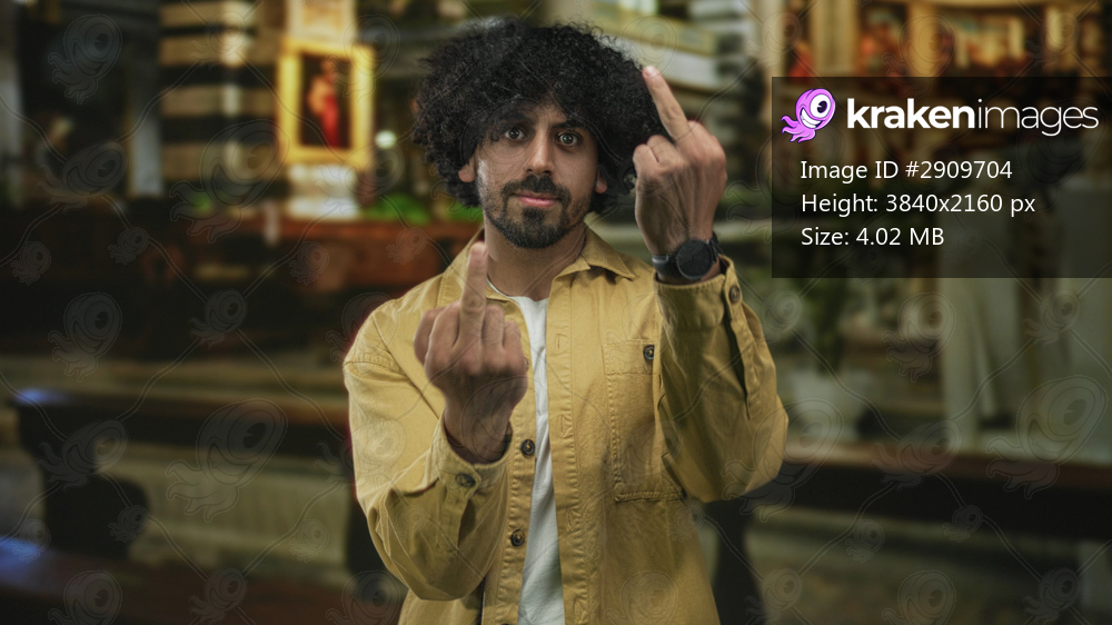Man with curly hair shows middle fingers with bare hands in church building interior near pews and altar; defiance protest.