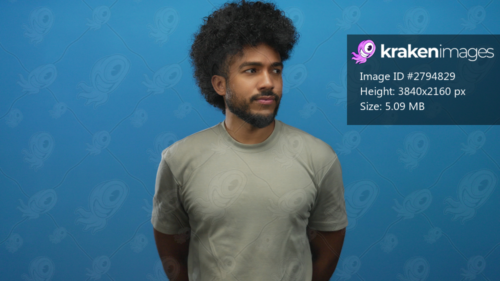 Man with curly hair smiling and pointing against a vibrant blue background exudes confidence and joy