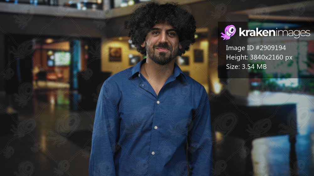 Man with curly hair smiling, visible face and open collar chest in a hotel lobby, wearing blue shirt and relaxed posture; friendly welcome.