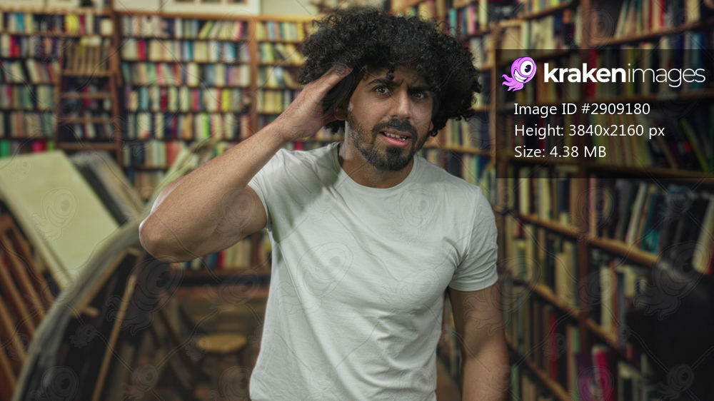 Man with curly hair stands among books in a building and touches forehead with his hand, looking puzzled; confusion curiosity.