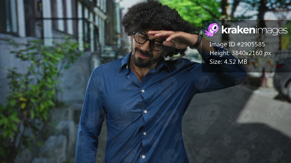 Man with curly hair touches hair, adjusts glasses and smiles while wearing a blue shirt on a city street near a sidewalk; urban casual confidence.