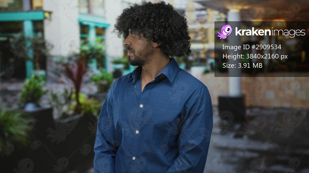 Man with curly hair turns head to the right on a street beside building planters, hands folded at waist; quiet contemplation.