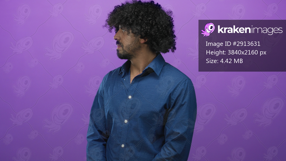 Man with curly hair and visible face wearing blue shirt turns head to left against purple backdrop in studio; contemplative solitude.