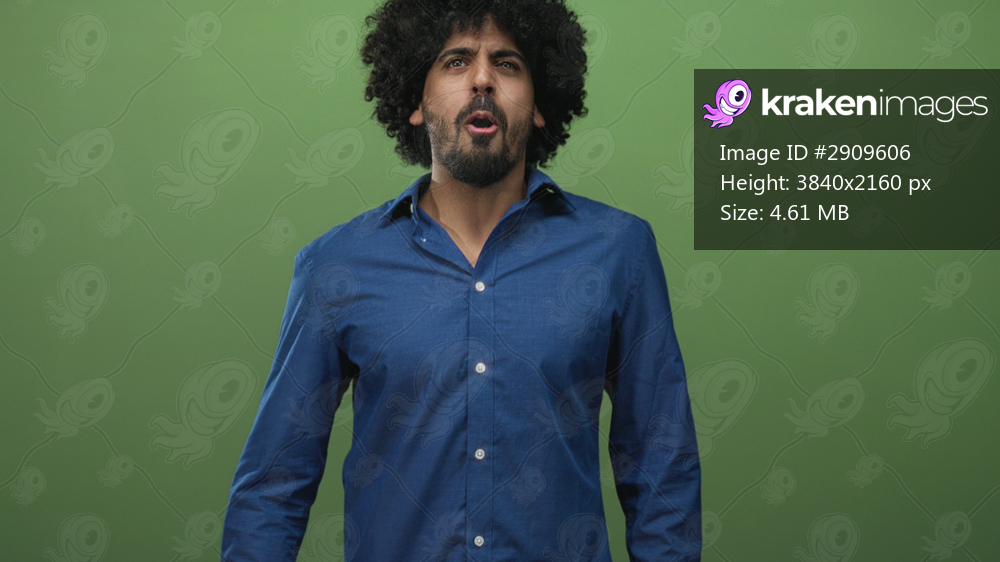 Man with curly hair wearing a blue shirt and wristwatch, raising fists and smiling toward camera in a green studio; excitement.