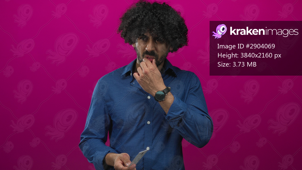 Man with curly hair wearing blue shirt holding smartphone and hand to chin in magenta studio; thoughtful reflection.