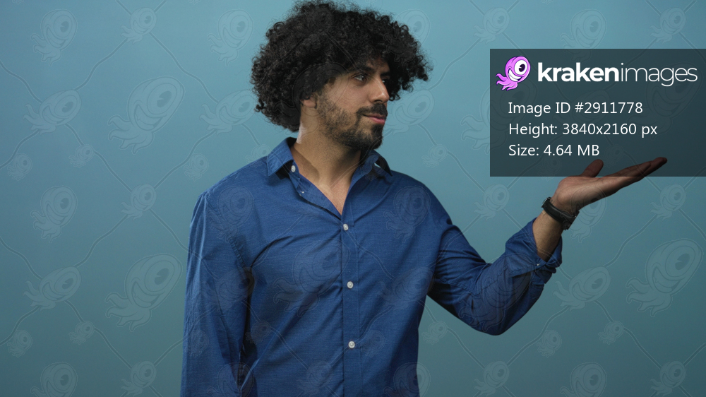 Man with curly hair wearing blue shirt, open palm raised and pointing finger in studio with teal backdrop; curiosity.