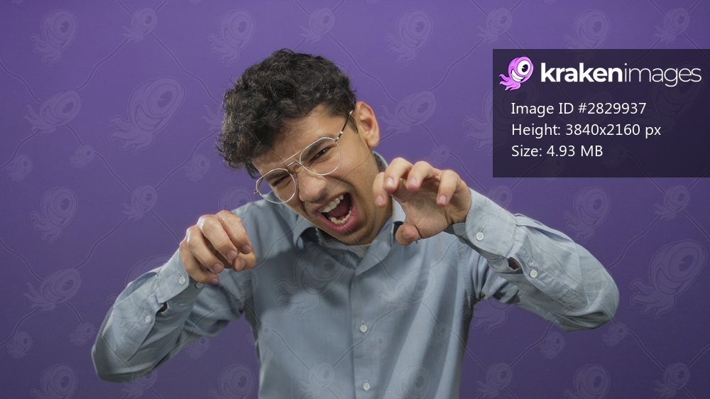 Man with curly hair wearing glasses and blue shirt claws hands and opens mouth in purple studio; aggression.