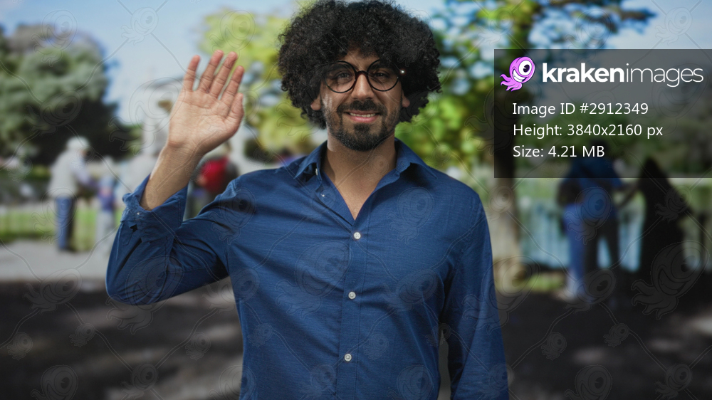 Man with curly hair wearing glasses and blue shirt smiling and raising hand in city park by pond; approachable warmth.