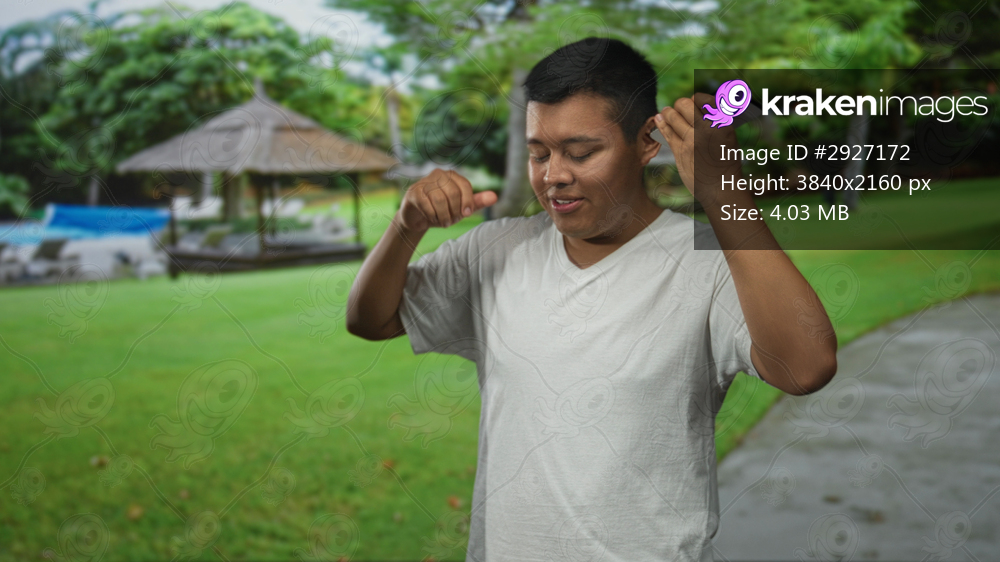 Man dancing with hands raised holding smartphone to ear on a street park walkway; joy celebration fun.