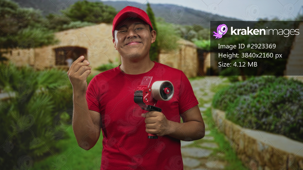 Man delivery worker holding tape dispenser and making pinching fingers gesture on stone path in park; pride duty.