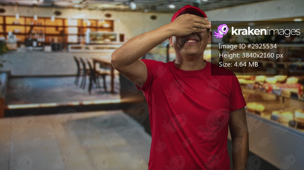Man delivery worker in red cap and shirt covers his eyes with his hand at a pastry counter inside a building bakery display; playful surprise.