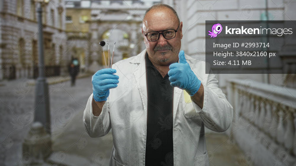 Man dentist in white coat with blue gloves holding dental mirror and probe, giving thumbs up on street; confidence care trust.