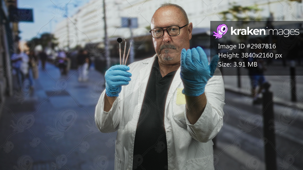 Man dentist in white coat holds dental mirror and probe, gloved hand raised on a city street; confidence duty.