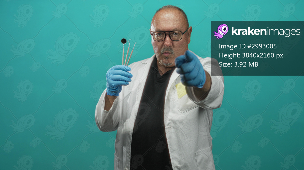 Man dentist in white coat holds dental mirror and probes, wearing blue gloves and points hand toward camera in studio; confidence professional care.