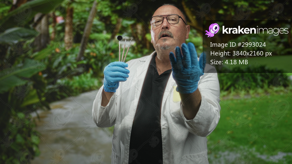 Man dentist in white coat points finger while holding dental mirror and probe on forest path; confidence care.