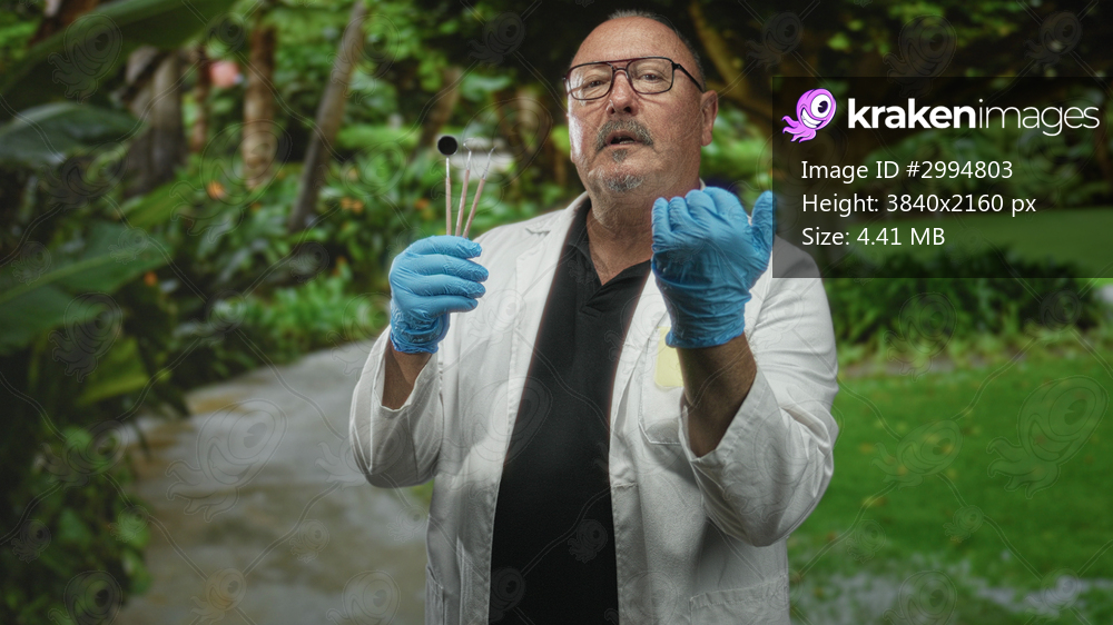 Man dentist in white coat points finger while holding dental mirror and probe on forest path; confidence care.