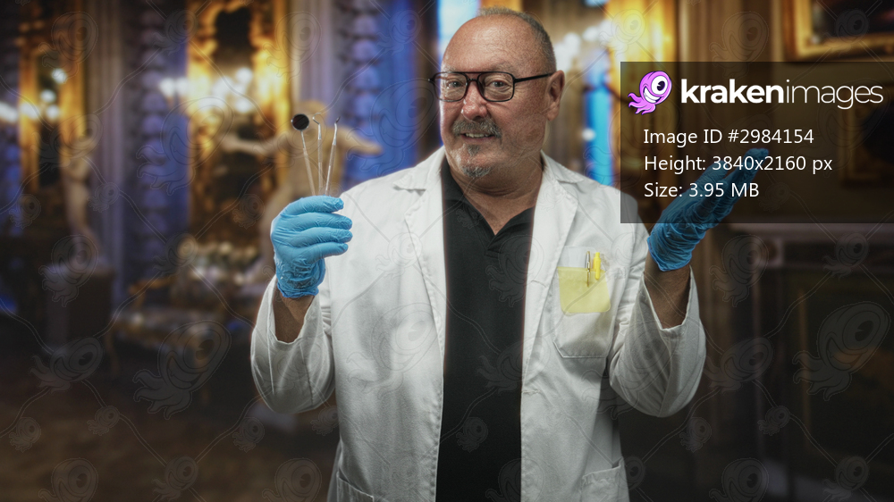 Man dentist points finger to dental mirror wearing blue gloves and white labcoat in ornate building; confidence expertise.