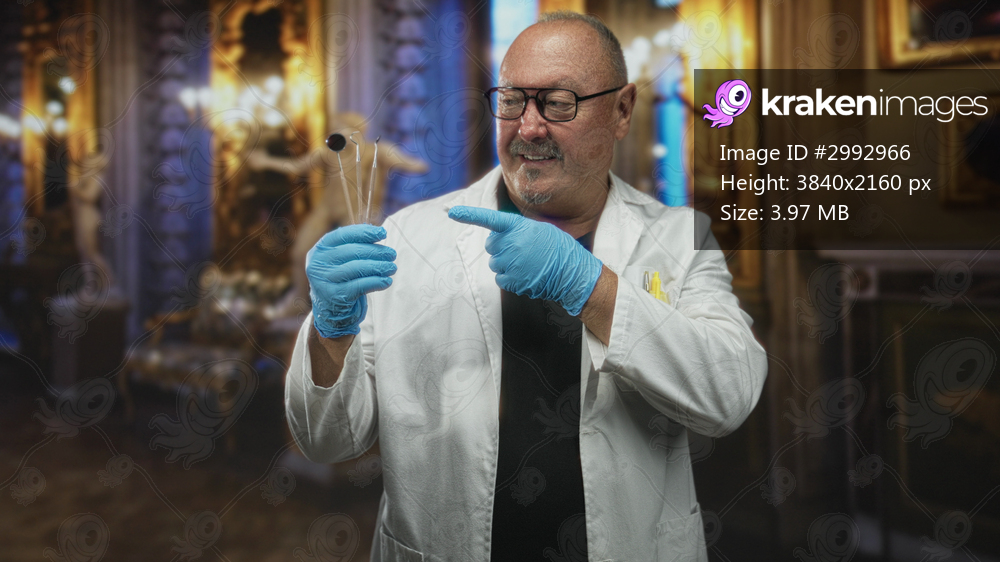 Man dentist points finger to dental mirror wearing blue gloves and white labcoat in ornate building; confidence expertise.