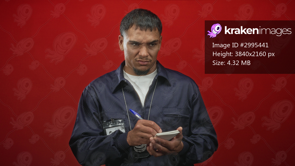 Man detective with badge and id card writing notes on a notepad with pen, hands visible, wearing navy shirt in studio; focused duty.