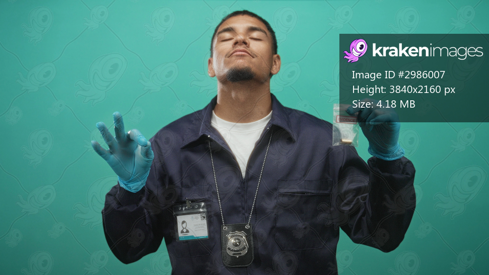 Man detective holds evidence bag and makes ok sign with gloved hand, showing badge on lanyard in studio; confidence duty.