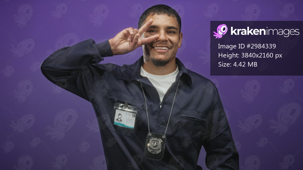 Man detective wearing a visible badge and id, navy jacket and white tee, making a peace sign with his hand by his face in a purple studio; playful confidence. - Kraken Images