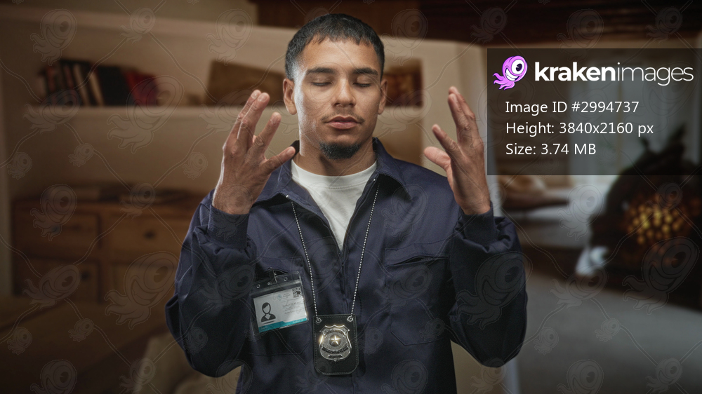 Man detective wearing badge and id on a chain, hands raised with closed eyes in an indoor building setting, facing camera; quiet introspection.