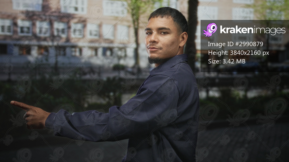 Man detective wearing badge and idcard on chain, looking down with a slight smile on street beside canal and building, hands relaxed at sides; calm vigilance. - Kraken Images