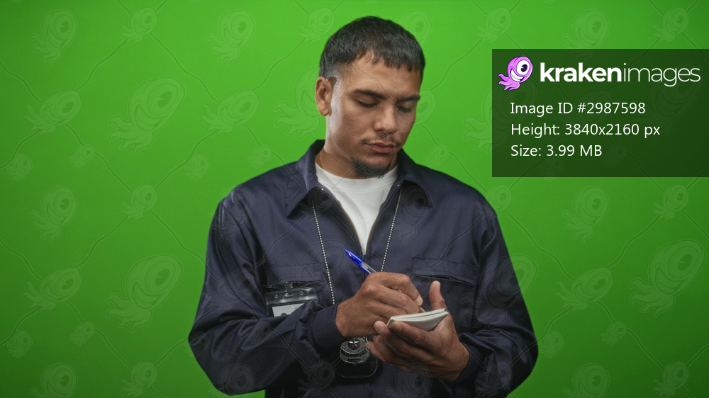 Man detective writing in a small notepad with pen and visible badge on chain in studio; focused concentration.